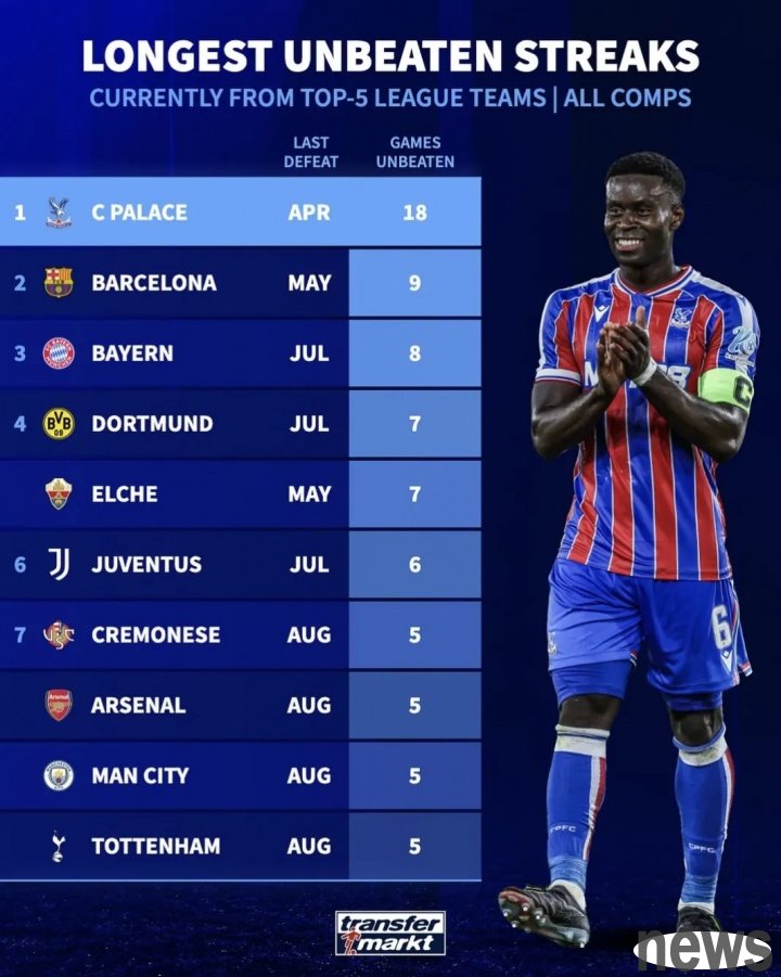 According to German transfer statistics, Crystal Palace is the team with the most unbeaten games in all competitions in the five major leagues. They have been unbeaten in 18 games across the seasons since April.