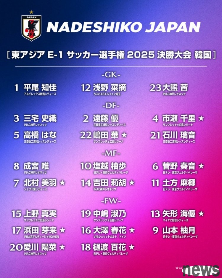 Guards: 3-Shizai Miyake (Kobe Lioness), 2-Yuyuki Endo (Urawa Red Diamond Women's Football), 4-Shenri Ichise (Hiroshima Three Arrow Women's Football, selected for the first time), 5-Takahashi Ka (Urawa Red Diamond Women's Football), 22-Hishimada (Hiroshima Three Arrow Women's Football, selected for the first time), 21-Riyo Ishikawa (Urawa Red Diamond Women's Football),