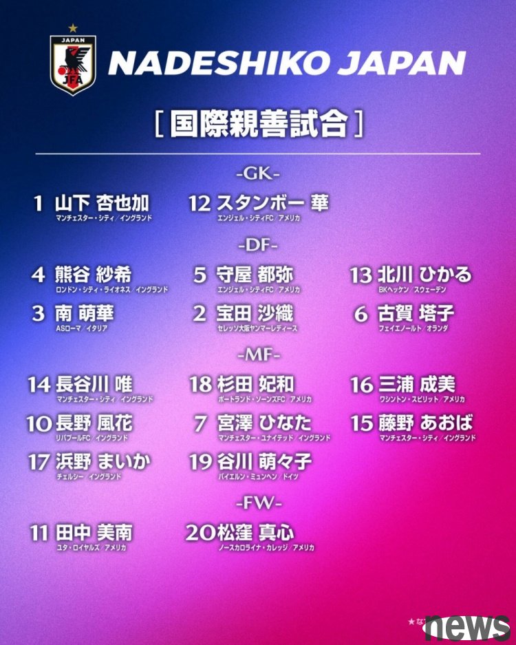 Midfielders: 14-Hosei Hasegawa (Manchester City Women's Football Team), 18-Suzuda (Portland Thorns), 16-Miura Sei The United States (Washington Spirit), 10-Nano Fenghua (Liverpool Women's Football), 7-Miyazawa Hyuga (Manchester United Women's Football), 15-Funo Aoba (Manchester City Women's Football), 17-Maika Hamano (Chelsea Women's Football), 19-Mimonko Tanikawa (Bayern Women's Football)