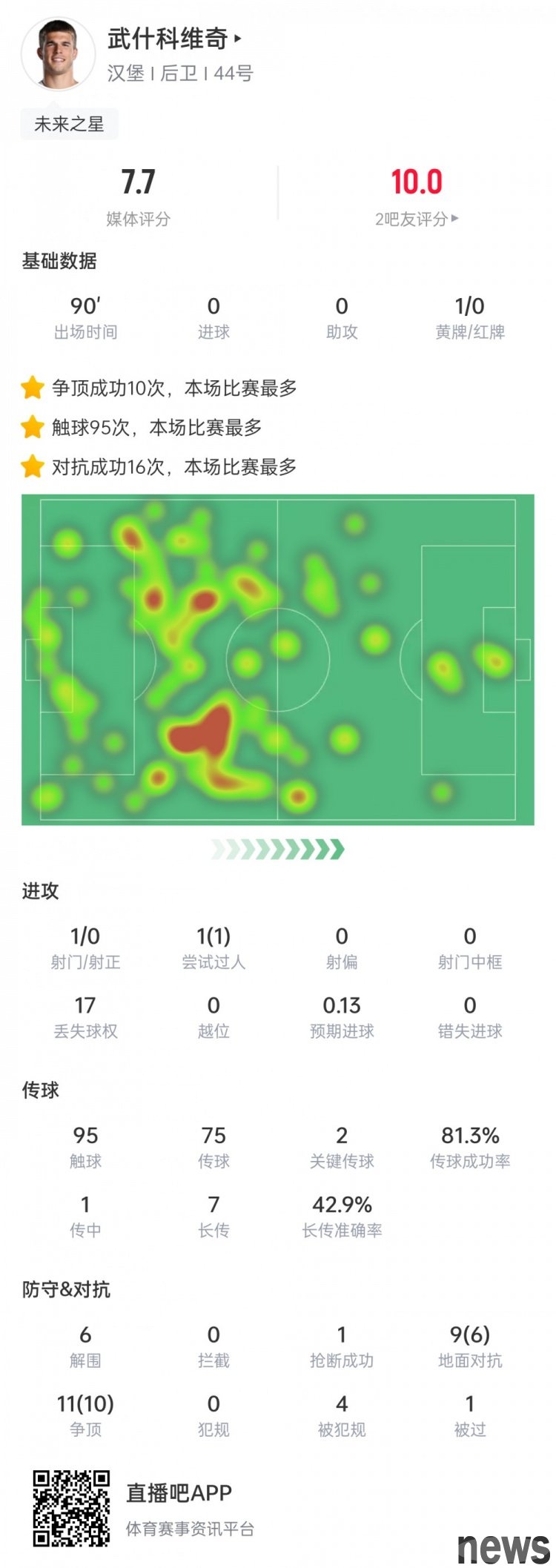 In the 8th round of the Bundesliga, 18-year-old central defender Vushkovic played the entire game. Hamburg lost 0-1 at home to Wolfsburg. Vushkovic successfully fought for the top 10 times in this campaign, the most in the game. According to Sofasco...