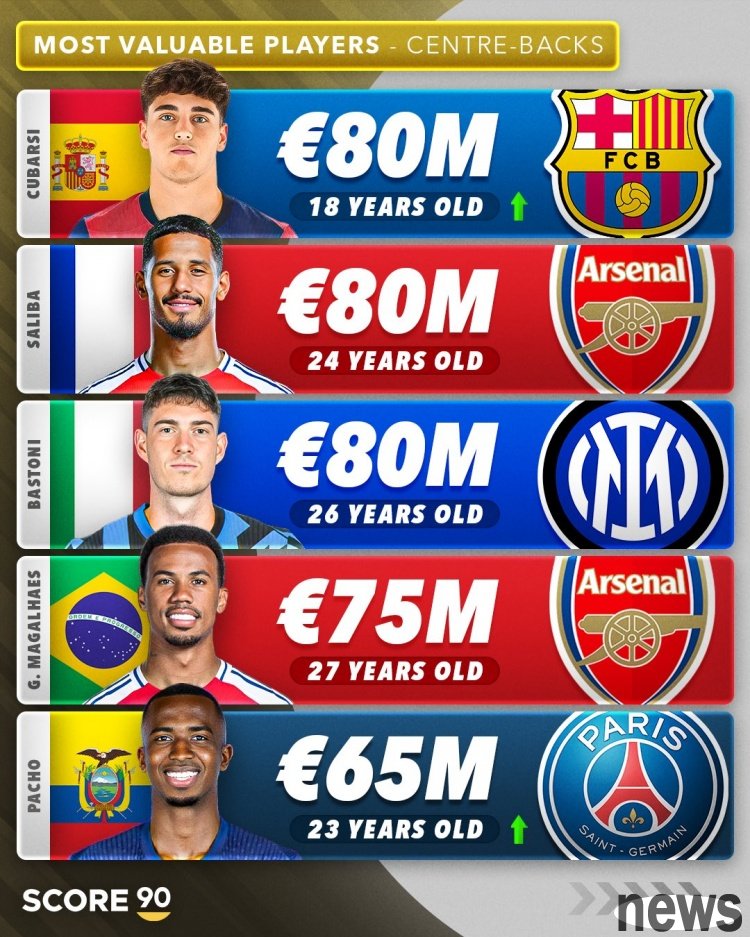 The 2024-25 season ended, Score 90 updated the value ranking of the centre-back. Barcelona central defender Kubasi, Arsenal central defender Saliba and Inter central defender Bastoni were all tied for 80 million euros, tied for first place. Central...