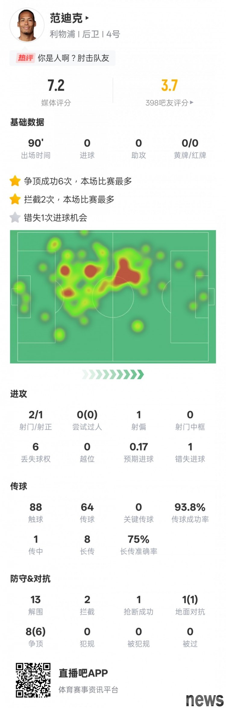 The focus of the 8th round of the 2025-26 Premier League season, Liverpool 1-2 Manchester United at home. Van Dijk started the game and succeeded in 6 aerial duels, the most in the game. He also made 13 clearances and 2 interceptions. He missed 1 scoring opportunity and scored 7.2.