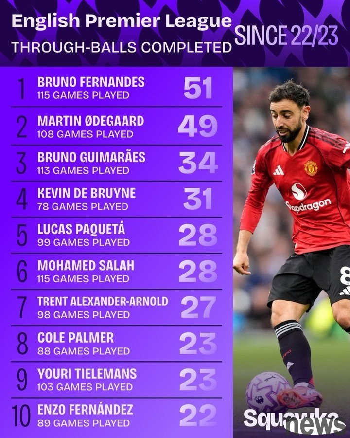 According to statistics from the data agency Squawka, since the 2022/23 season, B Fee has topped the list in the Premier League with 51 successful through balls in 115 games. Odegaard ranks second with 49 through balls in 108 games.