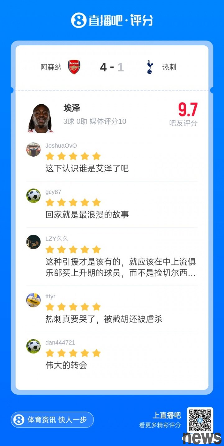 In Arsenal's 4-1 victory over Tottenham, Eze scored a hat-trick and led the team to victory, performing his best game since joining the Gunners. Eze received 68,000 votes from netizens and was elected [Best Player of the 12th Round of X Migu Sports Premier League]!