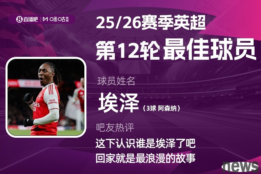 The 2025-2026 Premier League season is in full swing, and Migu Sports jointly launched each round of the Premier League's best player selection event! The results of the 12th round of selection have been released, and Eze was elected! In Arsenal...